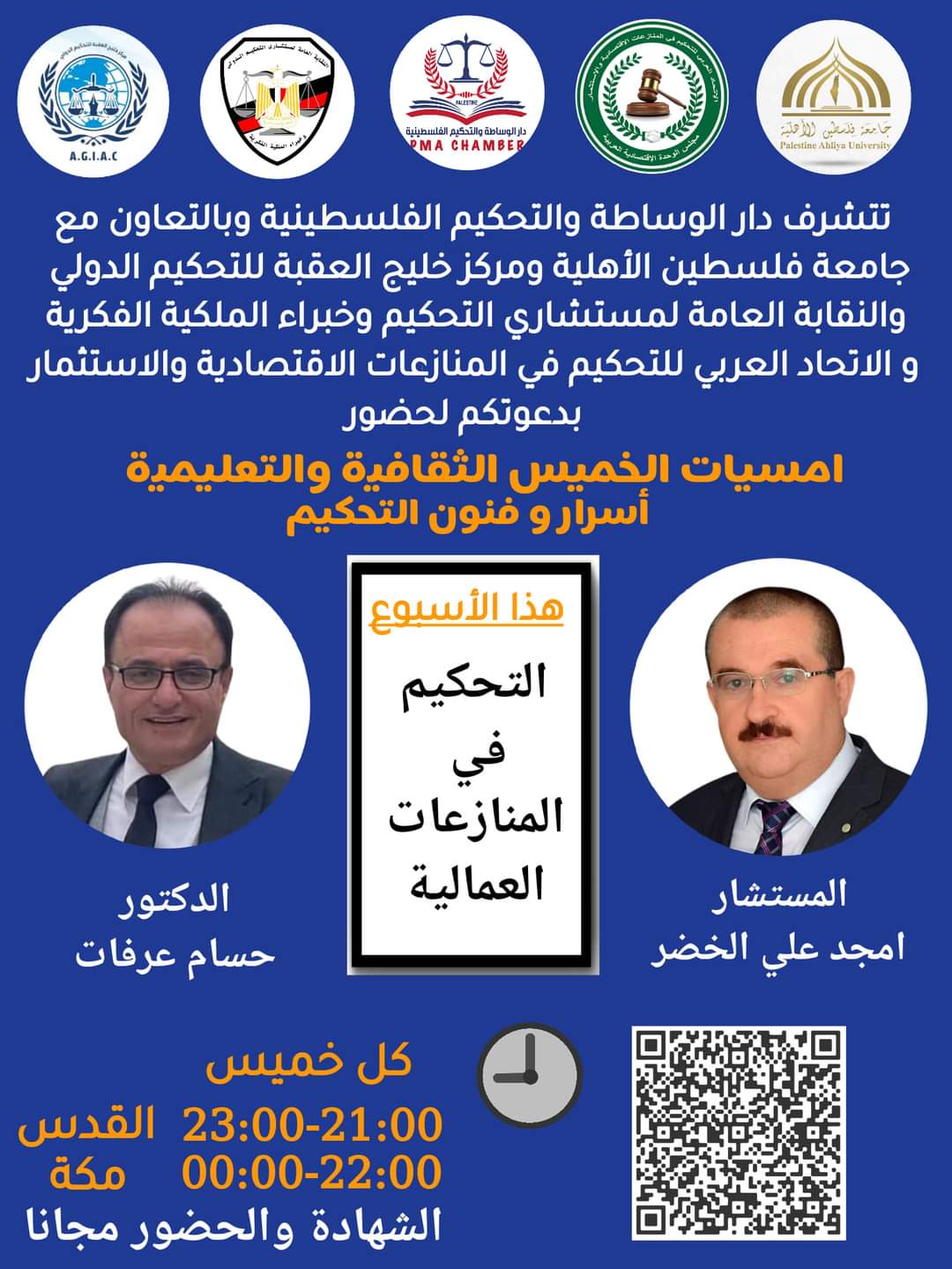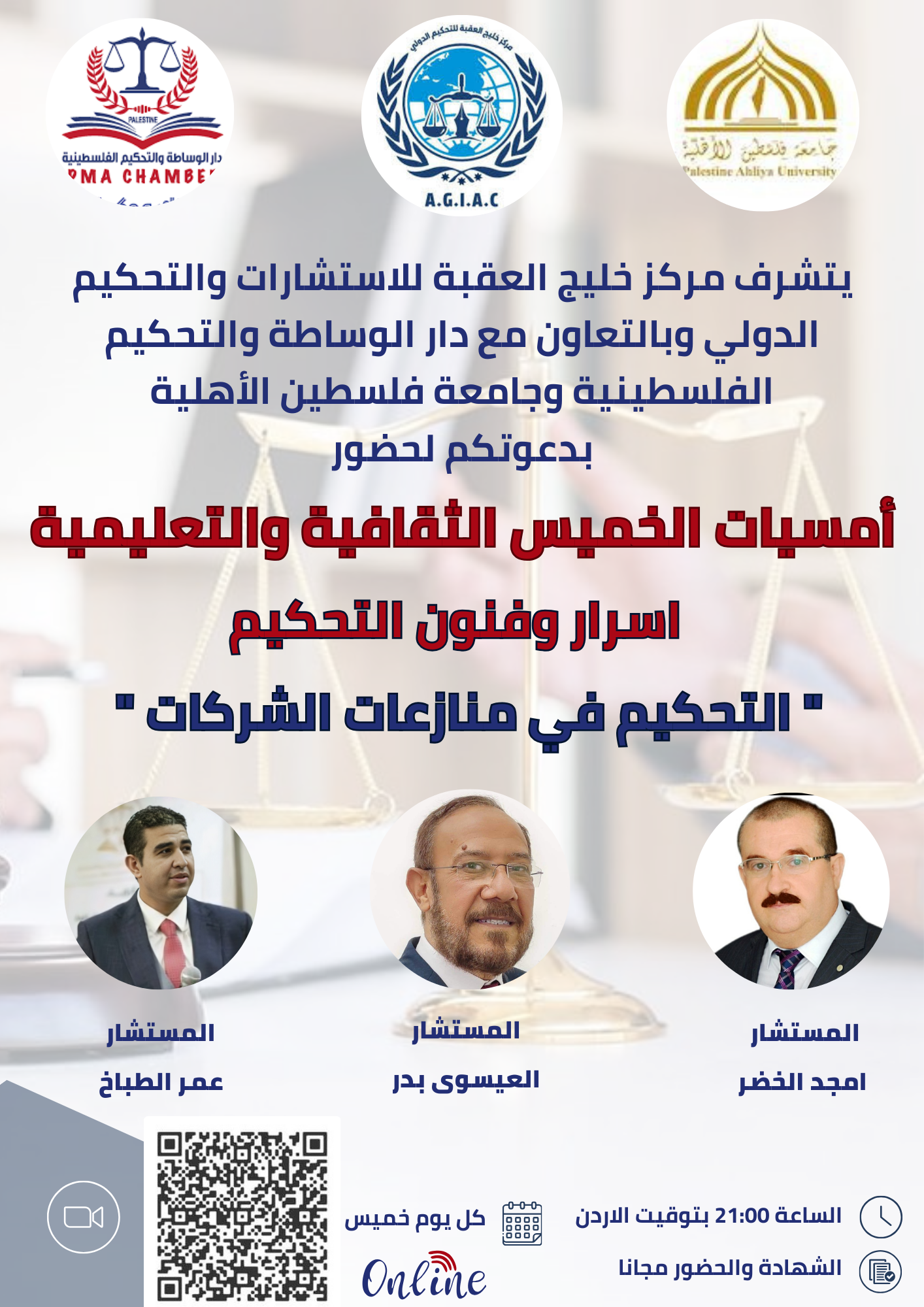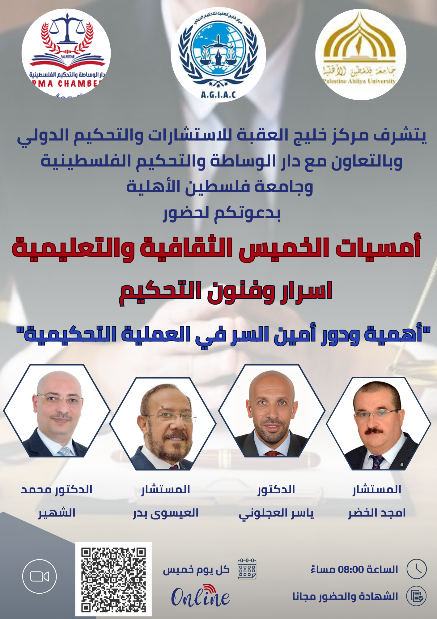 الدعوة عامة والحضور مجاني يتشرف مركز خليج العقبة للاستشارات والتحكيم الدولي وبالتعاون مع دار الوساطة والتحكيم الفلسطينية، وجامعة فلسطين الأهلية بدعوتكم للانضمام إلينا ضمن سلسلة أمسيات الخميس الثقافية والتعليمية – أسرار وفنون التحكيم . عنوان المحاضرة :“أهمية ودور أمين السر…