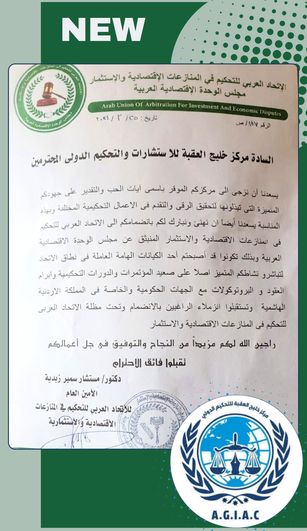بكل موثوقية وثبات وثقة يتقدم مركز خليج العقبة للاستشارات والتحكيم الدولي إلى منصة التحكيم العربية ليعلن من جديد أن كل جديد يظهر بيوم جديد على سكة وقاطرة التحكيم يكون لمركز خليج العقبة للاستشارات والتحكيم الدولي فيه بصمة . كما نبارك…