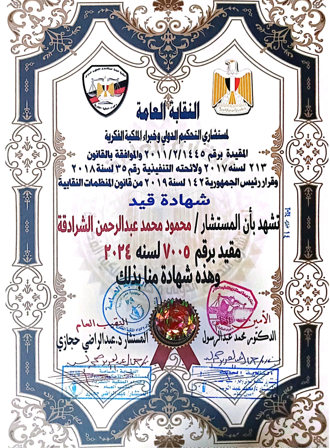 الاستاذ محمود الشرادقة يحصل على شهادة مستشار بالتحكيم الدولي