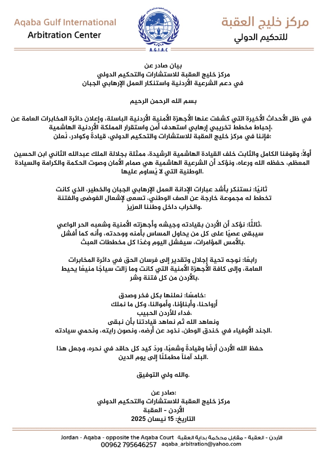 بيان صادر عن مركز خليج العقبة للاستشارات والتحكيم الدولي في دعم الشرعية الأردنية واستنكار العمل الإرهابي الجبان بسم الله الرحمن الرحيم في ظل الأحداث الأخيرة التي كشفت عنها الأجهزة الأمنية الأردنية الباسلة، وإعلان دائرة المخابرات العامة عن إحباط مخطط تخريبي…