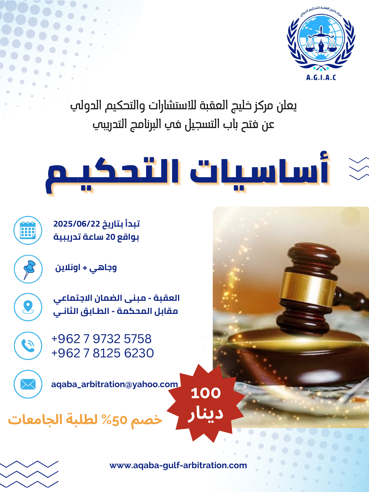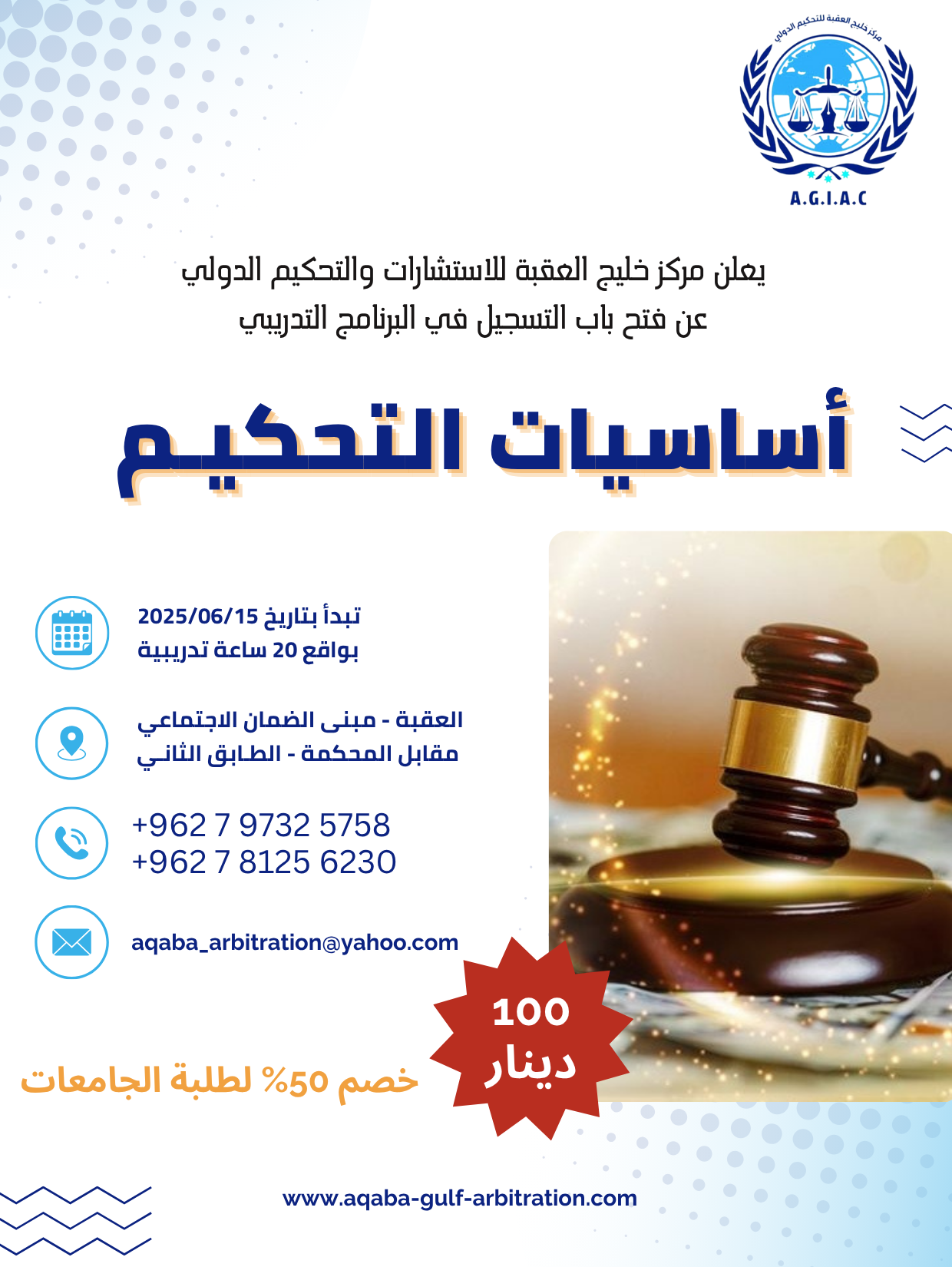 تمديد فترة التسجيل 📣📣📣 يعلن مركز خليج العقبة للاستشارات والتحكيم الدولي عن تمديد باب التسجيل في البرنامج التدريبي المكثف:“اساسيات التحكيم“ تفاصيل البرنامج: يحصل المشارك على: لا تفوت هذه الفرصة لتعزيز مهاراتك في مجال التحكيم والانضمام إلى نخبة من المحترفين في…