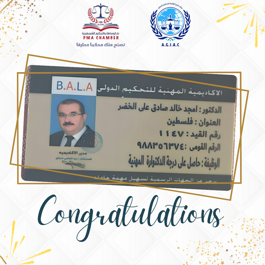 يتقدم مركز خليج العقبة للاستشارات والتحكيم الدولي ودار الوساطة والتحكيم الفلسطينية بخالص التهاني والتبريكات إلى الهيئة العلمية على إنجازها الرائد بإصدار الكتاب الأول بعنوان: “التحكيم أفضل الحلول البديلة لتسوية المنازعات وفق قانون التحكيم الأردني”.يُعد هذا الإصدار إضافة علمية متميزة تأتي…