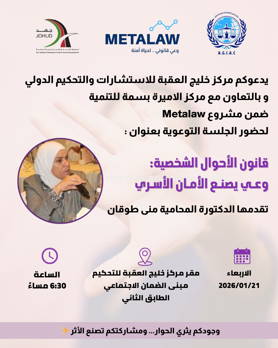 يدعوكم مركز خليج العقبة للاستشارات والتحكيم الدولي، وبالتعاون مع مركز الاميرة بسمة للتنمية، وضمن مشروع Metalaw، لحضور جلسة توعوية بعنوان: “قانون الأحوال الشخصية: وعي يصنع الأمان الأسري” وجودكم يثري الحوار… ومشاركتكم تصنع الأثر ✨