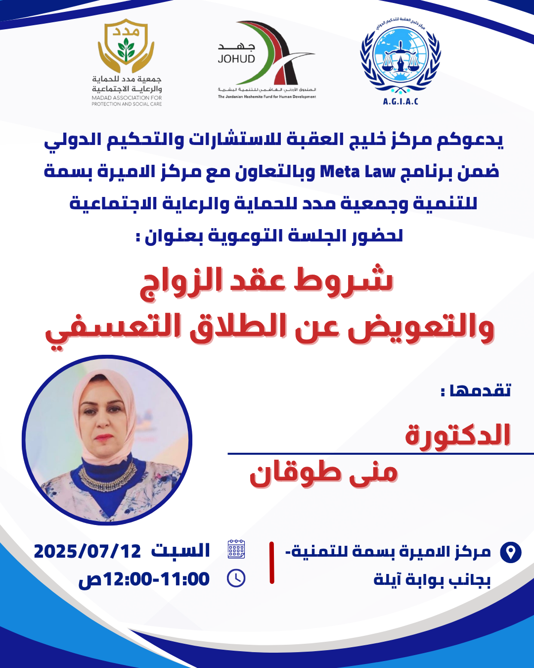 يسر مركز خليج العقبة للاستشارات والتحكيم الدولي، ضمن برنامج Meta Law، وبالتعاون مع مركز الأميرة بسمة للتنمية– العقبة وجمعية مدد للحماية والرعاية الاجتماعية، دعوتكم لحضور جلسة توعوية بعنوان: “شروط عقد الزواج والتعويض عن الطلاق التعسفي” تقدمها: الدكتورة منى طوقان بانتظار…