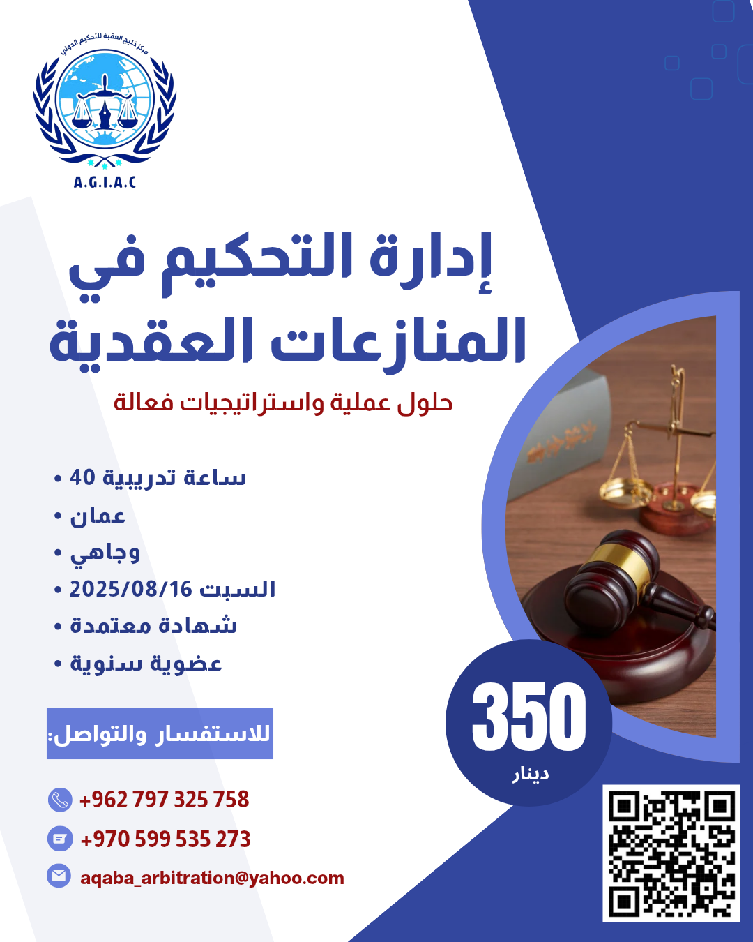🎯 فرصة تدريبية لا تُفوّت! هل تعمل في مجال القانون أو الهندسة؟ مهتم بالتحكيم وتسوية المنازعات؟ يعلن مركز خليج العقبة للاستشارات والتحكيم الدولي عن فتح باب التسجيل في برنامجه التدريبي المتخصص بعنوان: إدارة التحكيم في المنازعات العقدية -حلول عملية واستراتيجيات…