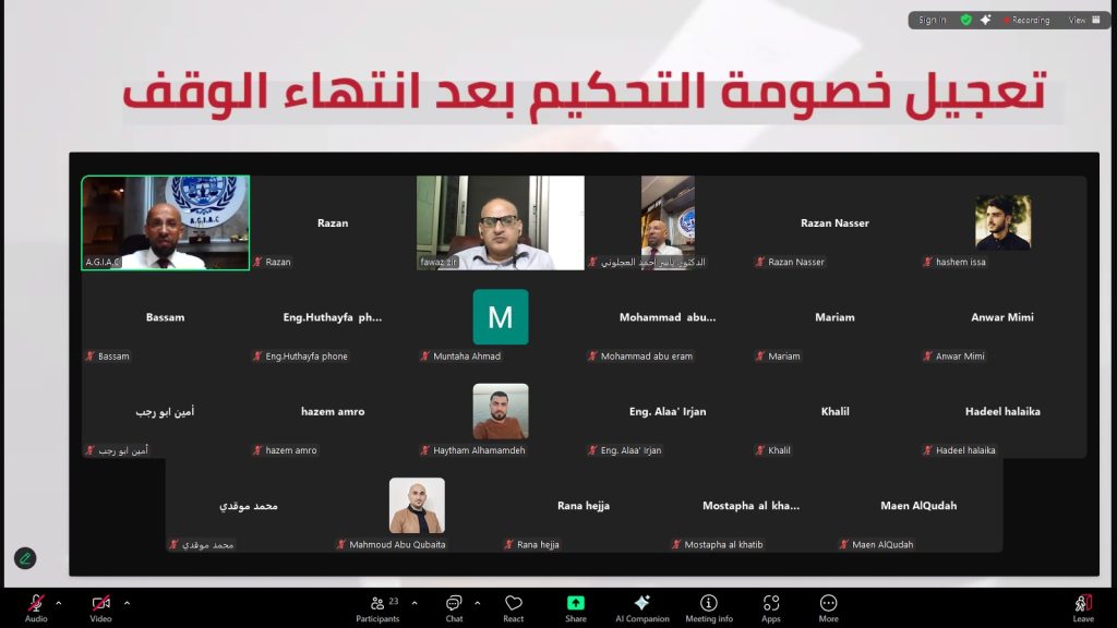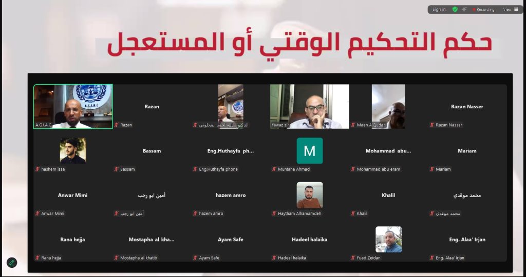 عُقدت مساء اليوم الجلسة السادسة من البرنامج التدريبي “أساسيات فض المنازعات العقارية – التحكيم نموذجًا” عبر الفضاء الرقمي zoom، بمشاركة موظفين وطلبة دراسات عليا من دولة فلسطين الشقيقة ولبنان .