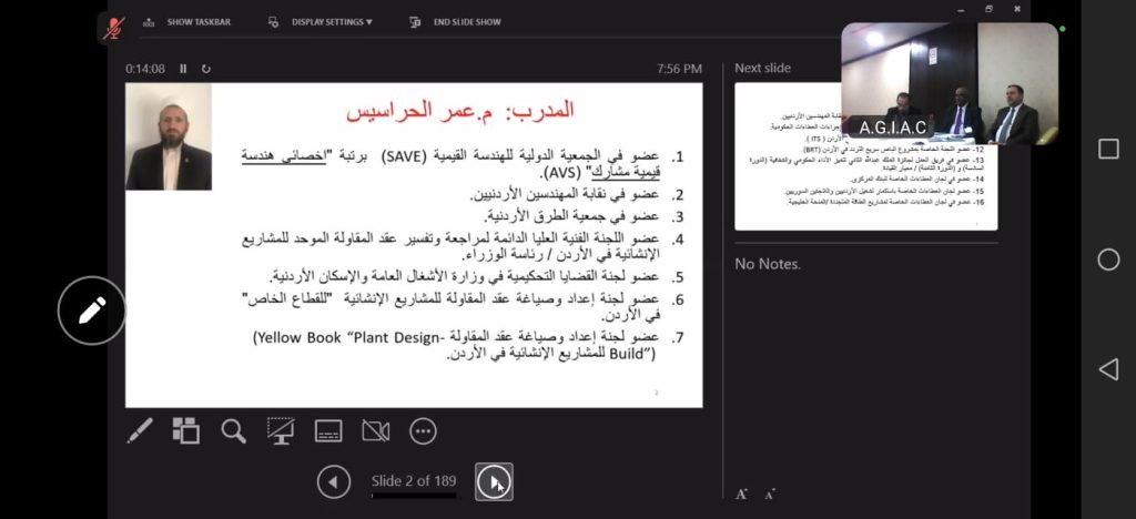 ورحب الدكتور ياسر العجلوني بالمشاركين مؤكدًا أهمية مثل هذه البرامج في تطوير الكفاءات الوطنية في مجالات القانون والهندسة والعقود وتزوديهم بآليات وأدوات فعالة تساعدهم في التعامل مع النزاعات العقدية وفق أحدث الممارسات العالمية.وافتتح الجلسة التدريبية الأولى المهندس عمر الحراسيس، متناولًا شرحا معمقا حول عقود المقاولات وعقود الفيديك، موضحًا الفروق الجوهرية بينها وأهميتها في المشاريع الهندسية والعقودية.