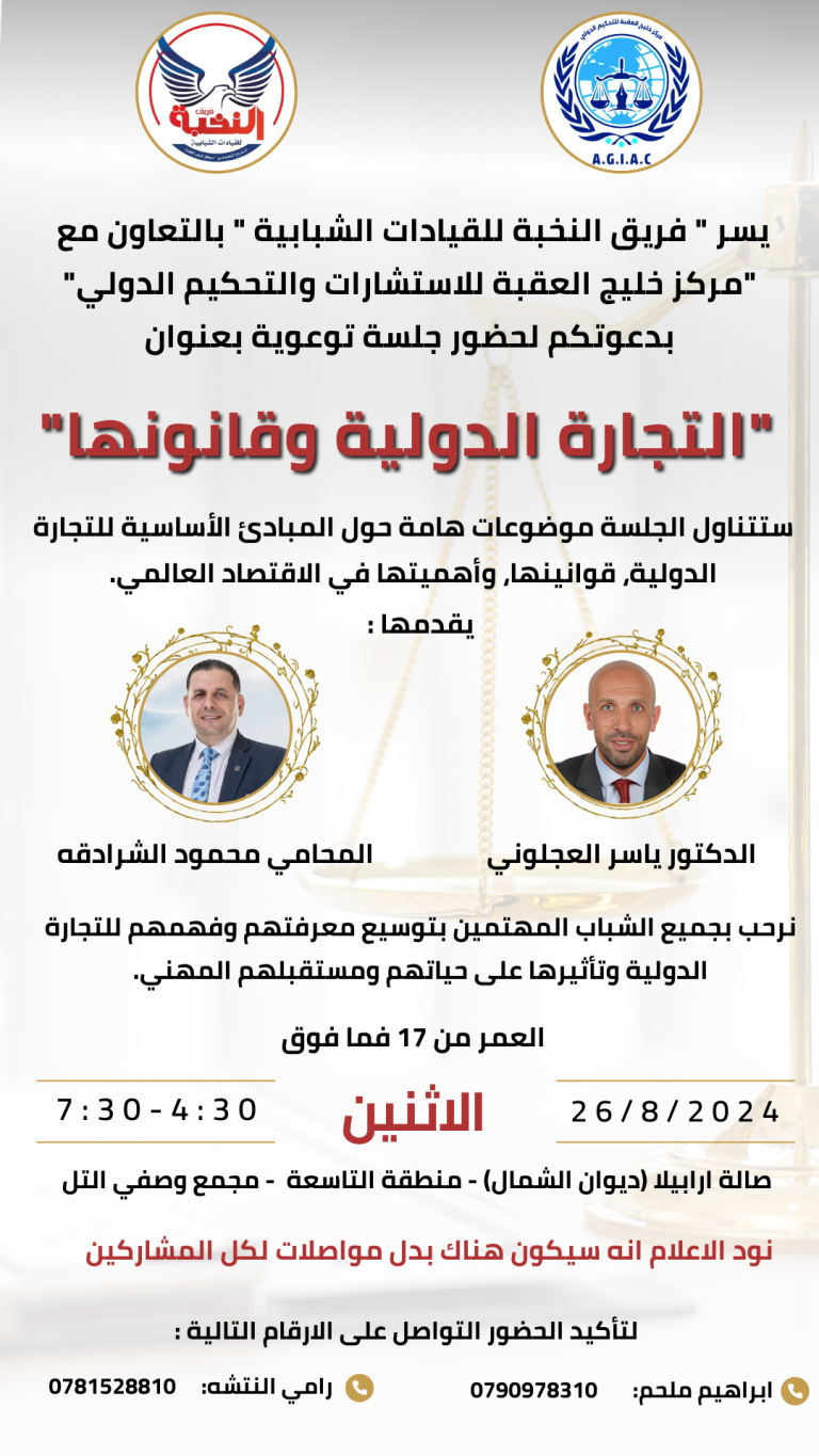 عقد مركز خليج العقبة للاستشارات والتحكيم الدولي وبالتعاون مع فريق النخبة للقيادات الشبابية جلسة توعوية بعنوان “التجارة الدولية وقانونها“، يوم الاثنين 2024/08/26 ، بحضور عدد من الشباب المهتمين بتوسيع معرفتهم وفهمهم للتجارة الدولية وتأثيرها على حياتهم ومستقبلهم المهني. تناولت الجلسة…