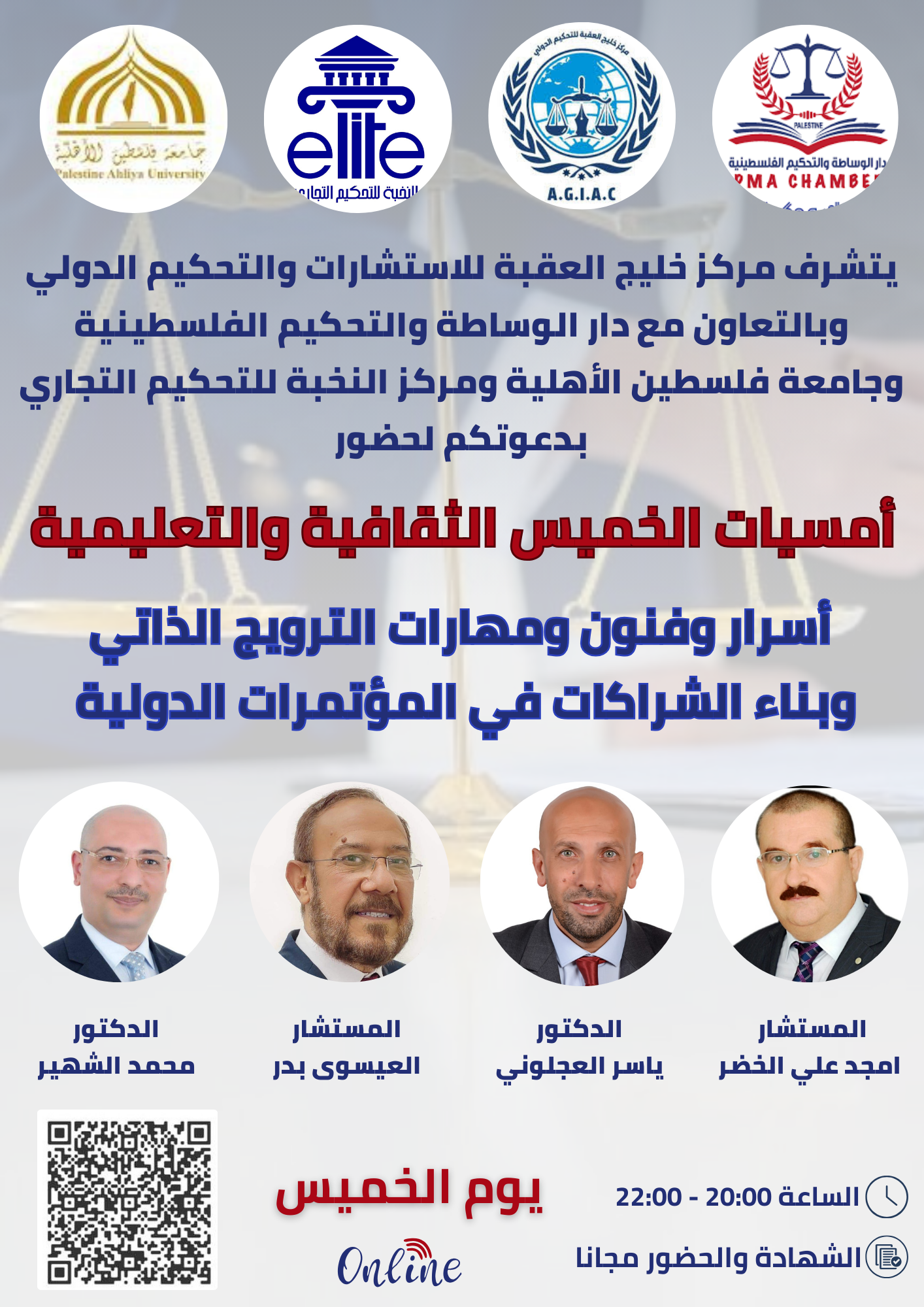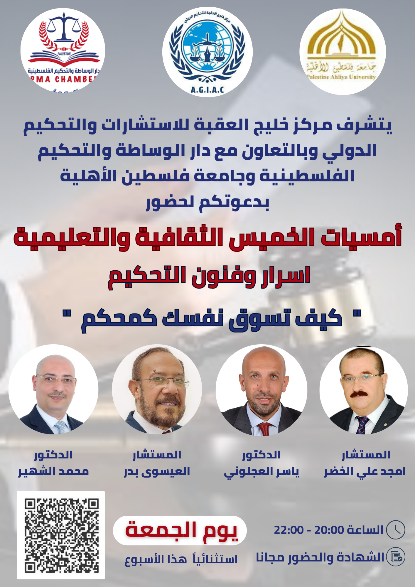 *الدعوة عامة والحضور مجاني* يتشرف مركز خليج العقبة للاستشارات والتحكيم الدولي وبالتعاون مع دار الوساطة والتحكيم الفلسطينية، وجامعة فلسطين الأهلية ومركز النخبة للتحكيم التجاري بدعوتكم للانضمام إلينا في الجلسة القادمة ضمن سلسلة أمسيات الخميس الثقافية والتعليمية – أسرار وفنون التحكيم…
